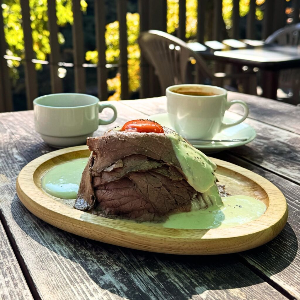 - 自家製ローストビーフ、卵黄、わさびヨーグルトソース、ライス