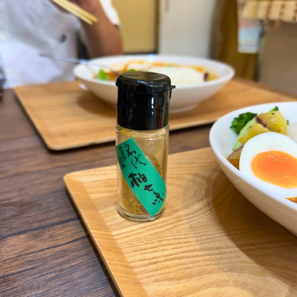 そのままでも十分美味しいのですが、味変アイテムとして「柚子七味」や、辛さ増し用の「カエンペッパー」も用意してくださっています。