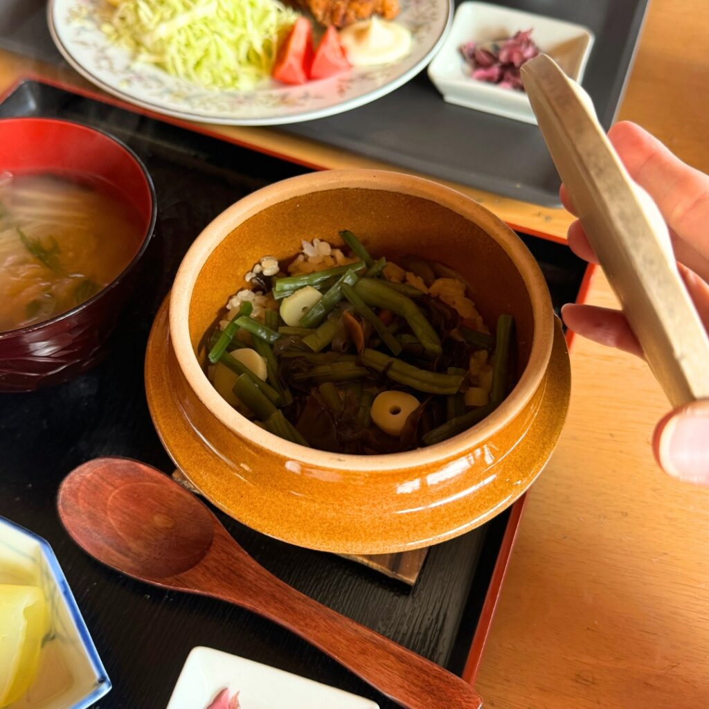 蓋を開けると湯気とともに山菜の香りが広がる「山菜釜飯」。